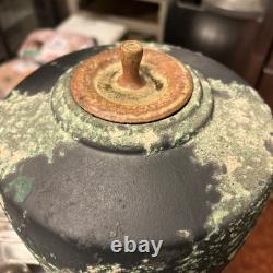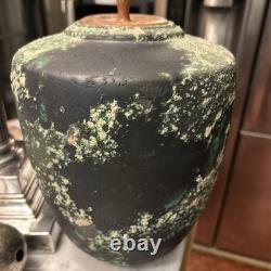 This vintage Raku pottery urn vase features a substantial size and iridescent black color with applied accents, giving it a unique and eye-catching appearance. Handmade in the Americas, this vase showcases a mid-century modern style with a studio theme, perfect for adding a touch of artistic flair to any space. Crafted from clay using pottery techniques, this art pottery piece belongs to the Raku product line, known for its distinctive and beautiful designs.